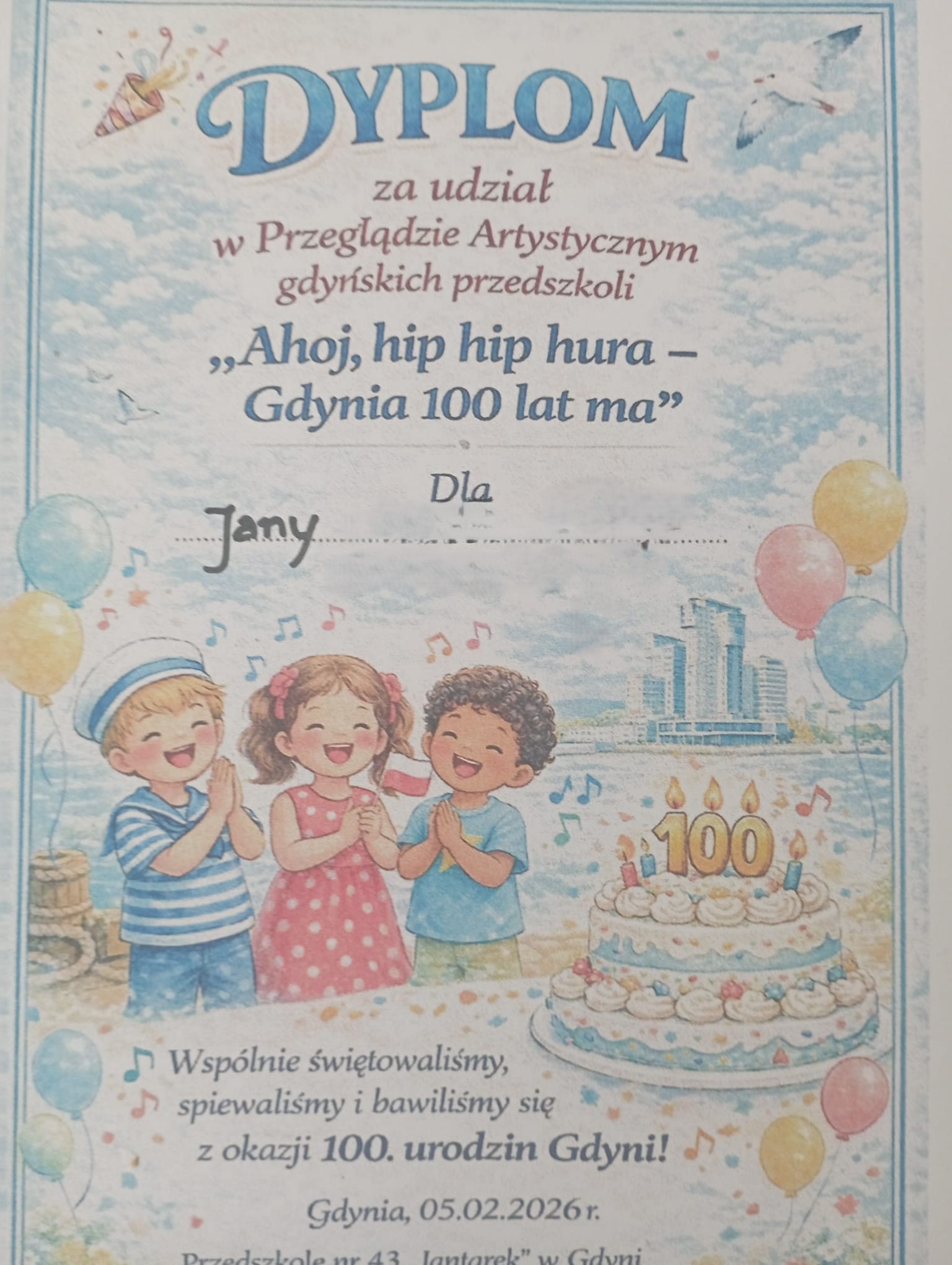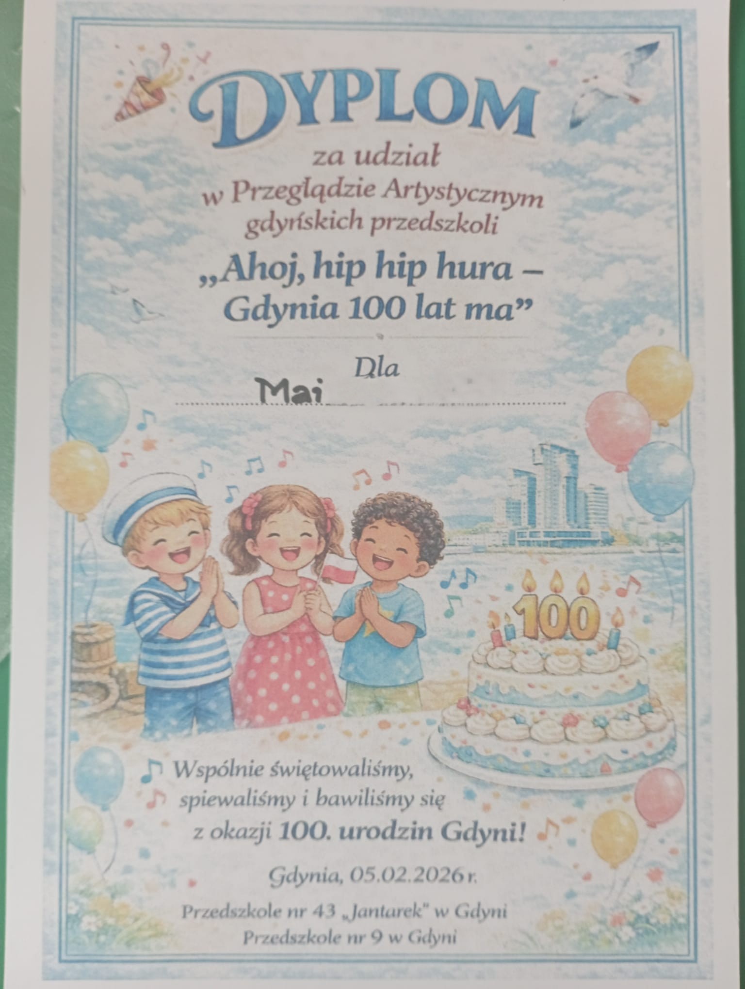 Nasze przedszkole reprezentowały dzieci z grupy najstarszej- Wilki Morskie: Maja i Jana. Razem recytowały wiersz o Gdyni. Za swój występ otrzymały dyplomy oraz prezent dla grupy. Po występie wszyscy uczestnicy zostali zaproszeni na tort urodzinowy.